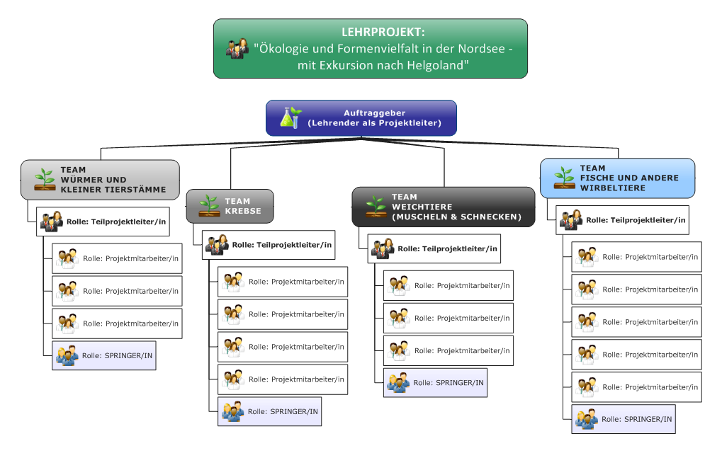 Wie das Schaubild zeigt, gab es noch eine weitere wichtige Rolle, da nicht immer alle Gruppen gleich viel Arbeitsaufwand haben können (z.B. aufgrund der Tatsache, dass nicht immer gleichmäßig viele Tiere in allen Gruppen eingefangen oder entdeckt werden). Je nach Aktivität (Kutterfahrt, Wattwanderung etc.) hatte das eine oder andere Team mehr oder weniger Arbeit. Deshalb habe ich mich dazu entschieden, dass jede Teilprojektleitung im Rotationsprinzip einen „Springer“ ernennt und dieser anderen Gruppen bei Bedarf unterstützend zu Hilfe kommt.
