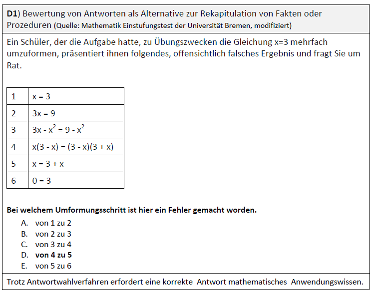 Eine andere Möglichkeit der Analyse eignet sich ebenfalls gut für Open book-Klausuren, wie sie in Zeiten von pandemiebedingten Online-Prüfungen via Moodle zu bevorzugen sind. Open book bedeutet, dass Sie Studierenden die Nutzung von Hilfsmitteln während der Prüfung erlauben (die Sie auch bei einer digitalen Klausuraufsicht, wie sie die RUB von Februar bis mindestens Oktober 2021 erlaubt, nicht verhindern können). Machen Sie es sich zunutze, dass die Studierenden an ihren privaten Geräten Zugriff auf das Internet haben, und „lassen Sie komplexe Anlagen (z.B Fachaufsätze) analysieren oder in Tabellenwerken, Datenbanken oder dem Internet recherchieren“ (Bücking 2014, 14). Auch Halbherr et al. empfehlen besonders für Open book-Klausuren die Rercherche in die Prüfungsaufgabe einzubinden: „So kann es im Sinne authentischer, kompetenzorientierter Prüfungen zum Beispiel durchaus Sinn machen, Studierende Fragestellungen zu ihnen noch unbekannten Fachthemen mittels Zugriff auf Forschungsdatenbanken und -Bibliotheken beantworten zu lassen. Schließlich ist das schnelle und zuverlässige Auffinden relevanter Informationen und das kompetente Einarbeiten in neue Fachthemen eine Schlüsselkompetenz in zahlreichen Disziplinen.“ (2016, 258) Diese Art von Aufgabe entspricht der Lernzielstufe vier, dem Analysieren von Sachverhalten. Als MC-Frage umgesetzt können Sie hier mit gezielten „Richtig / Falsch“-Fragen arbeiten. Das folgende Beispiel ist eine abgewandelte Form des obrigen Beispiels.
