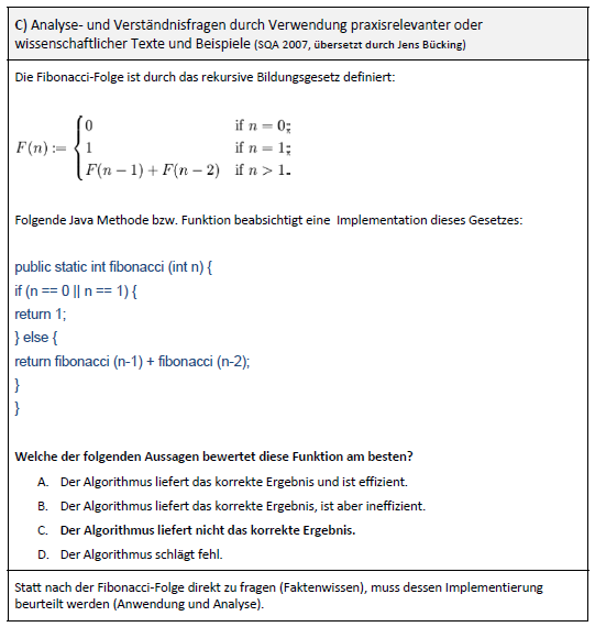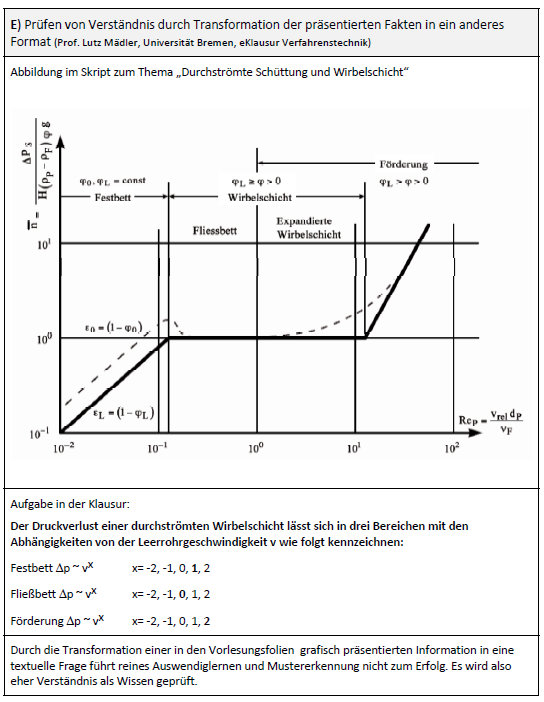 Wenn Sie vermeiden möchten, dass Studierende ein Beispiel auswendig lernen, empfiehlt es sich in der Lehre den Fokus auf Verständnis und Transfer zu legen. Das können Sie in der Prüfung mit angepassten Aufgaben/ Fragen adressieren, indem Sie nach analogen Beispielen suchen „anstatt auf bereits bekannte Fragen und Abbildungen aus Skripten, Foliensätzen und Tutorien zurückzugreifen“ (Bücking 2014, 14). Möglicherweise stellt sich dies als schwierig dar, weil Sie z.B. aufwendige Illustrationen nutzen möchten. Dann empfiehlt es sich, diese modifiziert abzubilden „z.B. 90°?Drehung“ (ebd), oder Sie beschreiben ein graphisches Beispiel in einer Textaufgabe (oder umgekehrt illustrieren Sie ein zuvor textlich dargestelltes Beispiel).